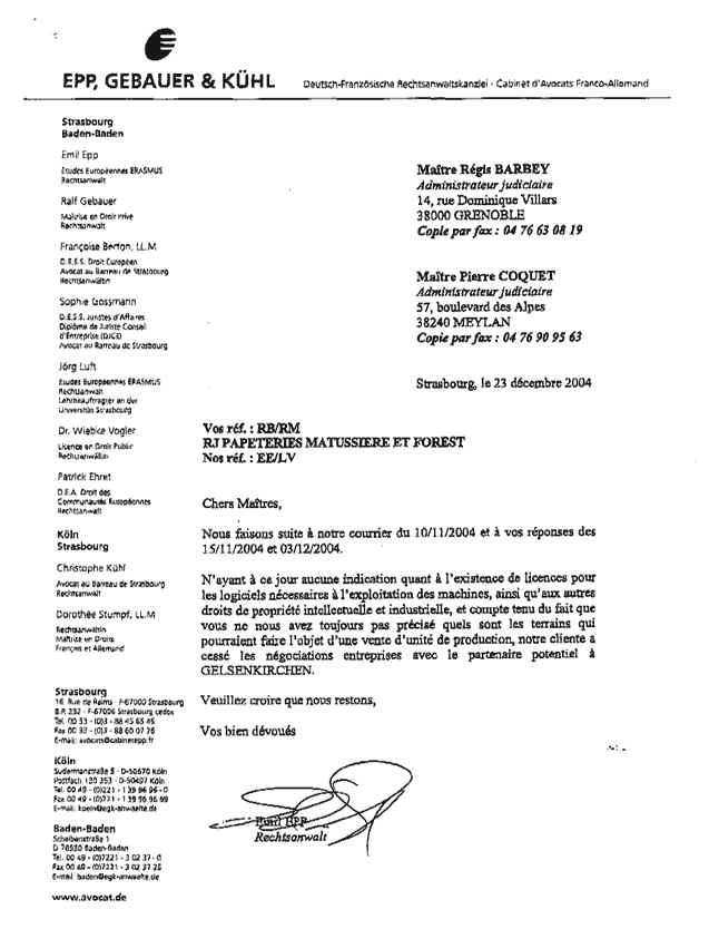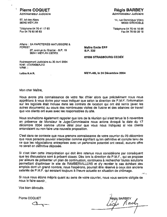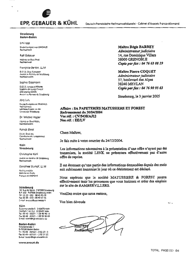 Fax du 23/12/2004 de Lenk aux administrateurs MF. Fax du 24/12/2004 Réponse des administrateurs Fax du 03/01/2005 Réponse de Lenk