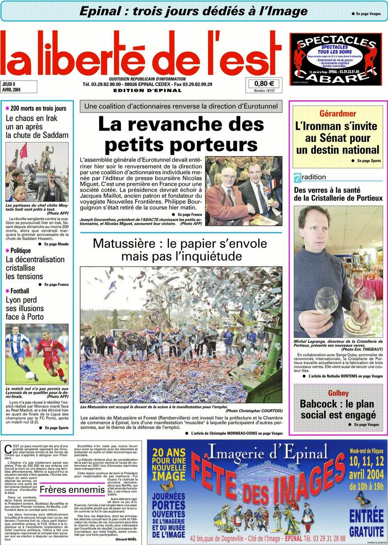 La une de La Liberté de l'Est du 08 avril 2004